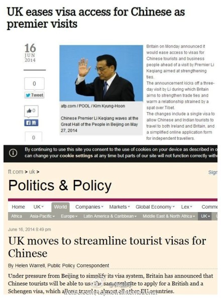 ????新華網(wǎng)北京6月17日電 據(jù)新華社“新國際”微博報道,李克強(qiáng)總理16日開始英國之行,英方當(dāng)日宣布將放寬對中國游客和商務(wù)人士的簽證限制,簡化中國個人旅行者網(wǎng)簽申請程序,而且英國正與其他歐洲國家談判,希望允許中國旅行者通過單一程序申請英國和申根國家簽證。此前,簽證難辦一直困擾赴英中國民眾。