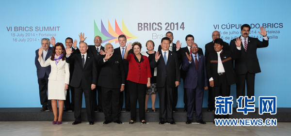 ????新華網(wǎng)巴西利亞7月16日電(記者陳威華、錢彤)7月16日,金磚國家同南美國家領(lǐng)導(dǎo)人對話會(huì)在巴西利亞舉行。中國國家主席習(xí)近平、巴西總統(tǒng)羅塞夫、俄羅斯總統(tǒng)普京、印度總理莫迪、南非總統(tǒng)祖馬以及蘇里南總統(tǒng)鮑特塞、阿根廷總統(tǒng)克里斯蒂娜、玻利維亞總統(tǒng)莫拉萊斯、哥倫比亞總統(tǒng)桑托斯、智利總統(tǒng)巴切萊特、厄瓜多爾總統(tǒng)科雷亞、圭亞那總統(tǒng)拉莫塔爾、巴拉圭總統(tǒng)卡特斯、秘魯總統(tǒng)烏馬拉、烏拉圭總統(tǒng)穆希卡、委內(nèi)瑞拉總統(tǒng)馬杜羅等南美國家領(lǐng)導(dǎo)人共同出席。