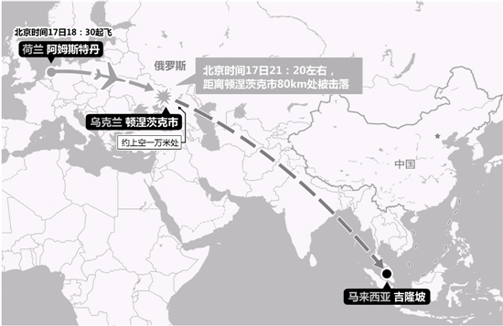 俄羅斯民航部門消息人士告訴路透社記者,這架馬來西亞客機(jī)沒有在預(yù)定時(shí)間進(jìn)入俄羅斯領(lǐng)空,墜毀于烏克蘭東部地區(qū)。
