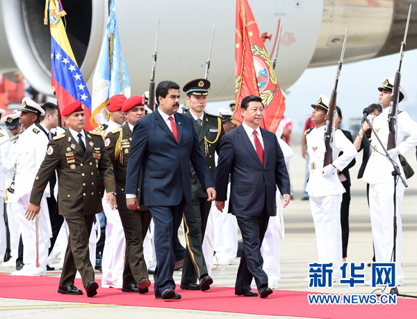 ??? 當(dāng)?shù)貢r(shí)間7月20日,國(guó)家主席習(xí)近平抵達(dá)加拉加斯,開(kāi)始對(duì)委內(nèi)瑞拉進(jìn)行國(guó)事訪(fǎng)問(wèn)。委內(nèi)瑞拉總統(tǒng)馬杜羅在機(jī)場(chǎng)為習(xí)近平舉行隆重歡迎儀式。新華社記者劉建生攝