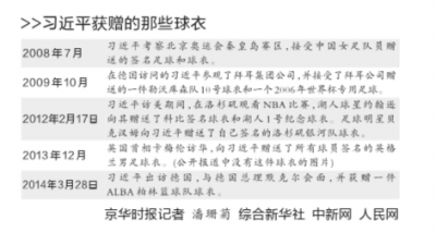 ????作為足球迷,能夠收獲著名球隊、球員的足球和球衣,恐怕是最讓別人羨慕的事兒了。習近平就曾經收到球星貝克漢姆簽名的球衣、德甲勒沃庫森隊球衣、2006年世界杯專用足球等,也包括中國女子足球隊隊員簽名的足球。