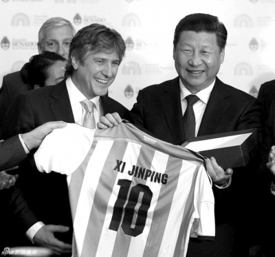????在和阿根廷副總統兼參議長布杜及眾議長多明格斯舉行會談時,習近平特別提到阿根廷足球隊在世界杯奪得亞軍,他說:“剛才眾議長先生問我是否喜歡足球,我說我非常喜歡足球。他也祝愿中國能夠早日舉辦一屆世界杯,這正是我的愿望。但是我們足球的發展,還希望同阿根廷加強交流合作,靠你們的幫助,提高我們的水平。”