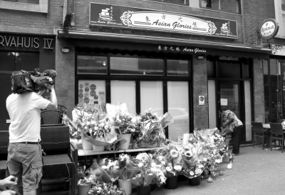 民眾在鹿特丹一家中餐館前悼念馬航空難中遇難的華人夫婦。新華社發
