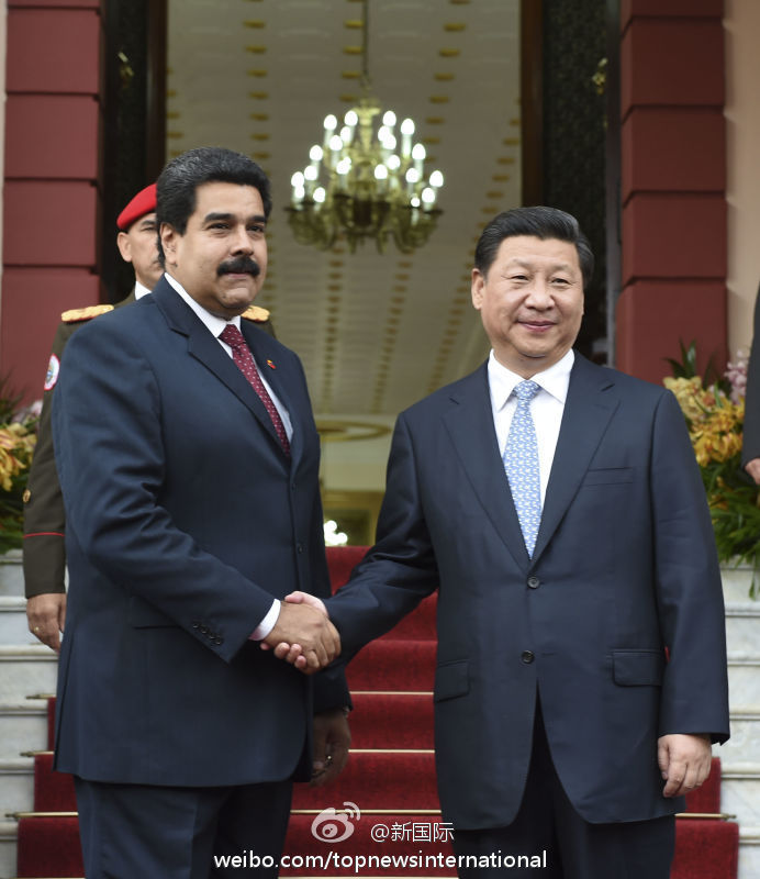 ??? 【習(xí)近平明確中委合作“引擎、主軸和輪子”】習(xí)近平20日同馬杜羅總統(tǒng)會談時說,我們要加強(qiáng)頂層設(shè)計(jì),以金融和投資為引擎,以能源合作為主軸,基礎(chǔ)設(shè)施建設(shè)、農(nóng)業(yè)、礦業(yè)、科技合作等多個輪子一起轉(zhuǎn),促進(jìn)中委合作全方位發(fā)展。(李學(xué)仁攝)