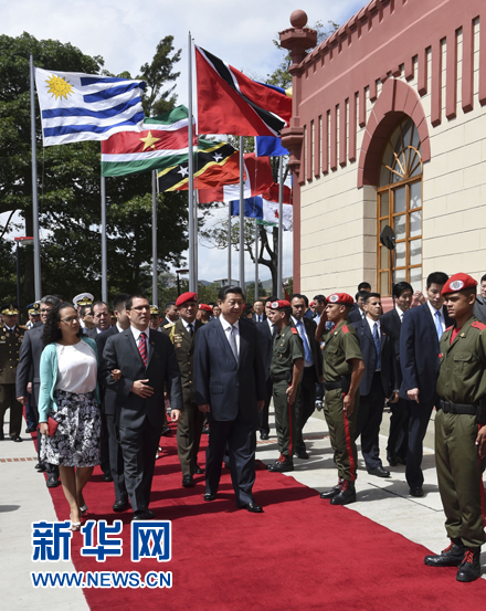 ????習近平抵達時,委內瑞拉副總統阿雷亞薩和夫人、查韋斯女兒羅莎率政府部長和三軍高級將領迎接。