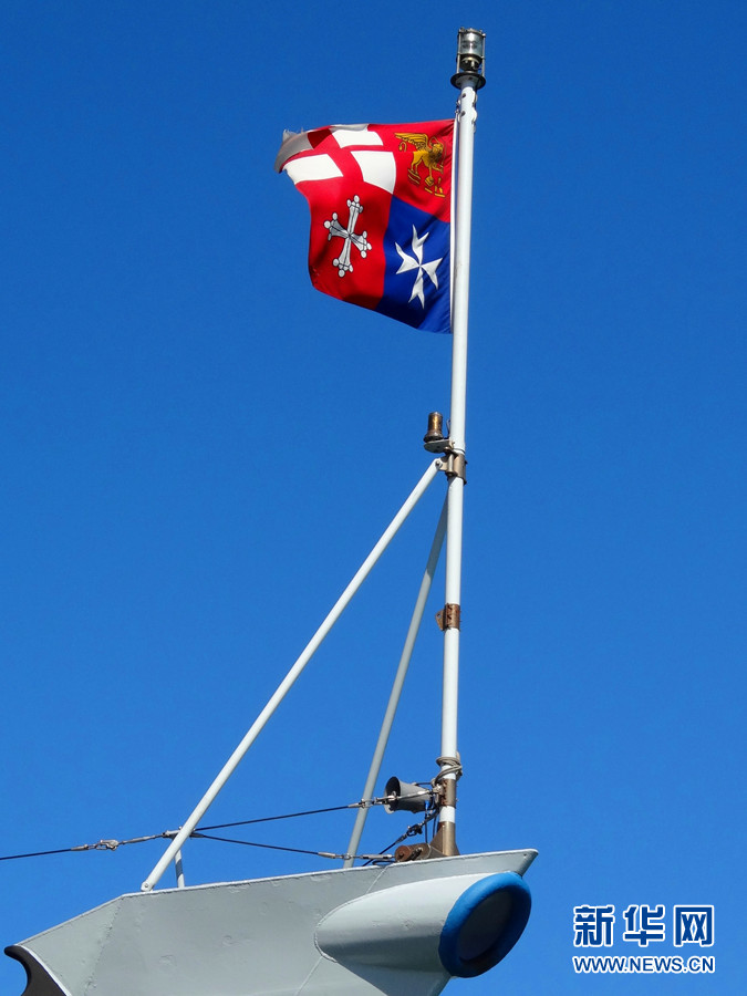 ????意大利海軍軍旗。帶領記者參觀的工作人員說,軍旗上的四塊標志代表了意大利的四個不同城市。新華網記者 周喆 攝