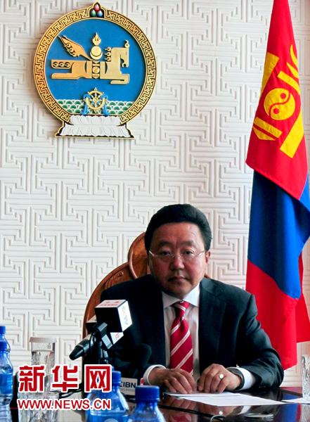 ??? 8月15日,蒙古國總統額勒貝格道爾吉在烏蘭巴托接受中國新聞代表團的聯合采訪。新華社記者馮堅攝