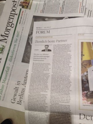 柏林市中心亞歷山大地鐵站的書報店里,洛塔爾·沙爾夫拿起一份報紙遞給我們:“今天的《世界報》上有你們總理發表的文章。”