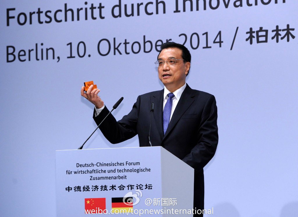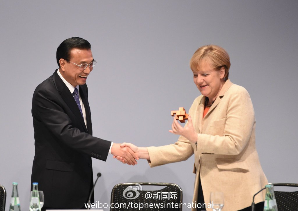 ????新華網北京10月11日電? 據新華社“新國際”微博報道,10日的中德經濟技術論壇上,李克強總理將一精巧的魯班鎖送給默克爾。他說,這是天津中德職業(yè)技術學院師生共同創(chuàng)作的作品,希望我送給默克爾總理。解開魯班鎖是解決一道難題,相信中德之間的合作能不斷創(chuàng)新,共同破解世界性難題,開啟美好的未來。