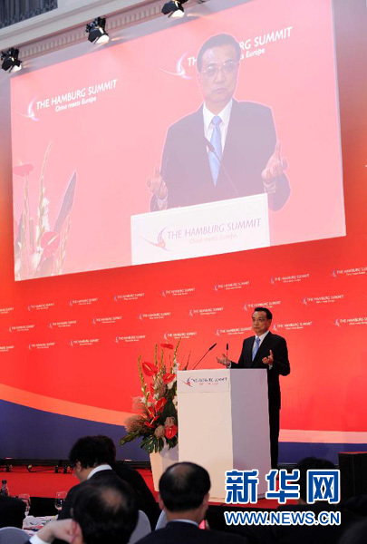 ??? 當?shù)貢r間10月11日中午,國務(wù)院總理李克強在漢堡出席中歐論壇漢堡峰會第六屆會議并發(fā)表題為《樹立互利共贏的新標桿》的主旨演講。新華社記者 饒愛民 攝