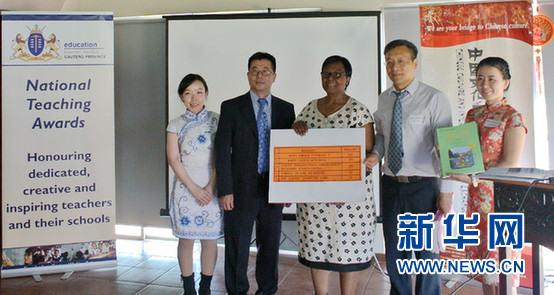 ????宋波向南茨瓦內(nèi)教育廳捐贈漢語教材,中左宋波,中右陸志雷博士。新華社記者郭興華 攝