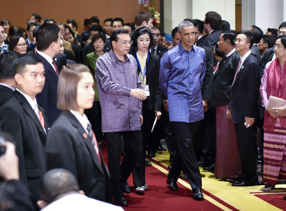 晚宴前,18位與會國領導人和潘基文身著緬甸特色服飾,站在印有緬甸名勝大金寺、大金石圖案的背景板前合影,克強總理站在正中間,“東道主”吳登盛一邊是奧巴馬,一邊是克強總理,足見主辦方對中國的重視。