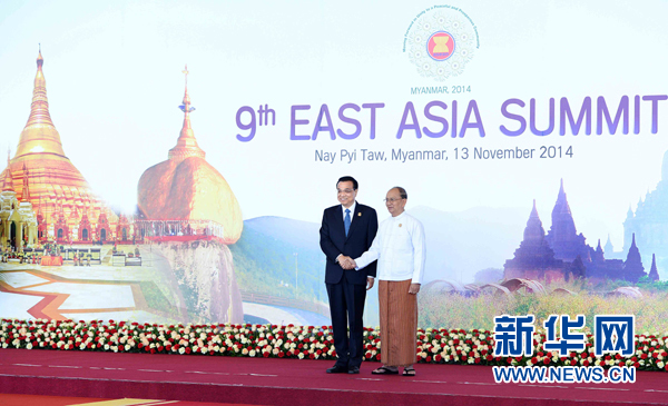 ??? 新華網內比都11月13日電(記者陳二厚 桂濤)國務院總理李克強當地時間13日上午在緬甸內比都出席第九屆東亞峰會。東盟十國領導人以及韓國總統樸槿惠、日本首相安倍晉三、美國總統奧巴馬、俄羅斯總理梅德韋杰夫、印度總理莫迪、澳大利亞總理阿博特、新西蘭總理約翰·基出席。緬甸總統吳登盛主持會議。