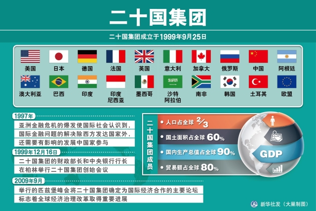 可以說,中國成功地引領了亞太區域合作方向與政策制定,極大地增強了中國在亞太治理中的發言權。如果說,APEC是一個成員限于亞太地區的區域性治理平臺,那二十國集團(G20)就是一個覆蓋面更廣的、全球性的治理平臺。G20由西方七國集團、俄羅斯和中國等主要新興經濟體組成,經濟規模約占全球90%,貿易總額占全球總量的80%。