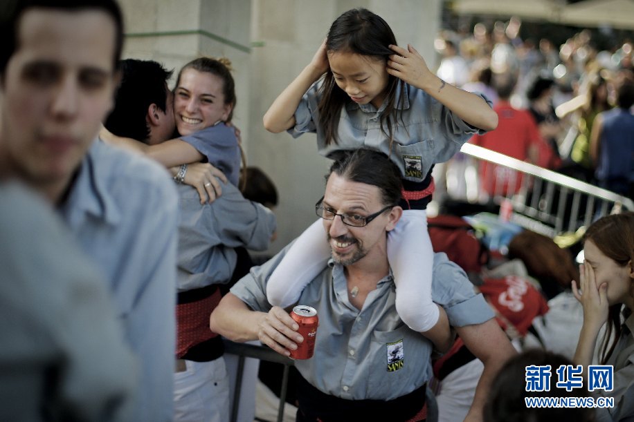 ????Jana騎在養父的肩膀上來到表演現場,兩人一起準備參加一場在巴塞羅那進行的表演。新華社巴塞羅那分社攝影師Pau Barrena 攝