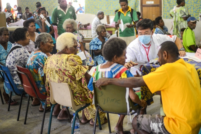 ????(圖為2014年9月5日,中國海軍和平方舟醫(yī)院船的前出醫(yī)療分隊前往位于瓦努阿圖首都維拉港郊區(qū)的美麗村,為因路途較遠而不方便前往和平方舟醫(yī)院船就診的當?shù)鼐用襁M行醫(yī)療服務(wù)。新華社記者覃海石攝)