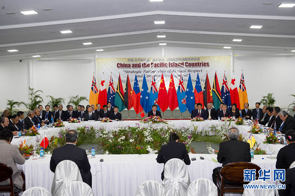???? 11月22日,國家主席習近平在楠迪同斐濟總理姆拜尼馬拉馬、密克羅尼西亞聯邦總統莫里、薩摩亞總理圖伊拉埃帕、巴布亞新幾內亞總理奧尼爾、瓦努阿圖總理納圖曼、庫克群島總理普納、湯加首相圖伊瓦卡諾、紐埃總理塔拉吉等太平洋島國領導人舉行集體會晤。習近平主持會議并發表主旨講話。新華社記者 饒愛民攝