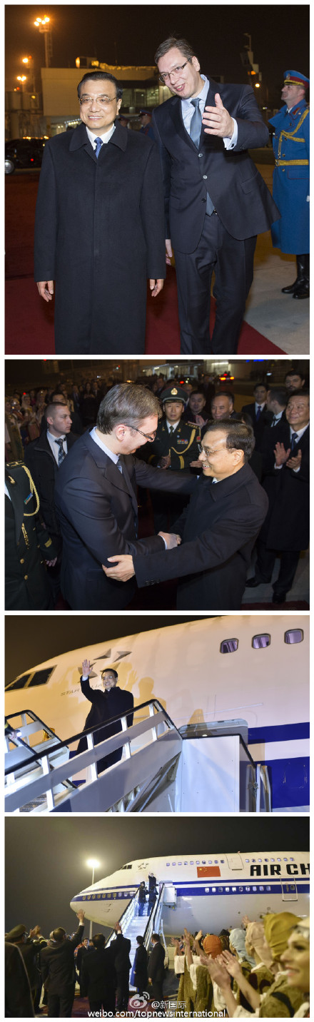 ??? 李克強總理當?shù)貢r間18日傍晚乘專機離開塞爾維亞首都貝爾格萊德。在塞期間,李克強出席了中國—中東歐國家領(lǐng)導人第三次會議并成功對塞爾維亞進行了首訪。塞爾維亞總理武契奇率兩位副總理和多位部長到機場送行。