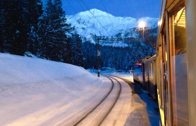 (專列在暮色中即將抵達達沃斯,窗外白雪皚皚,昏黃的燈光感覺很溫暖。攝影:王威)