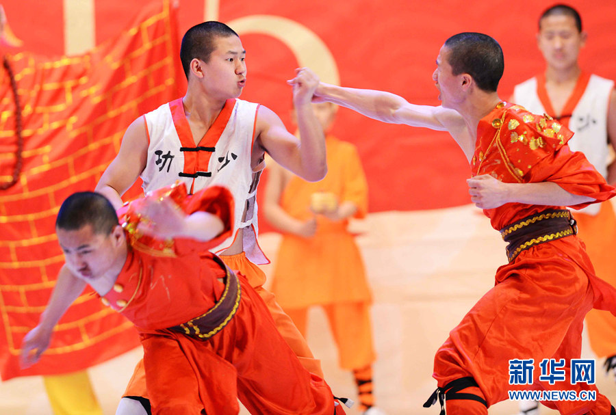 2月4日晚,在烏茲別克斯坦首都塔什干突厥宮,藝術家在表演中國武術和舞蹈。新華網(wǎng)記者 沙達提 攝