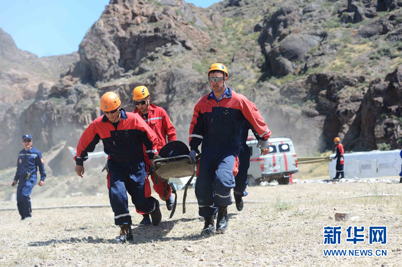 6月3日,代表中國參加上合組織國際救援聯合演練的新疆消防總隊隊員在哈薩克斯坦阿拉木圖州塔姆卡壘塔斯景區的哈內務部緊急情況委員會教練基地“巖石城-阿斯塔納”參加演練。新華社記者沙達提攝