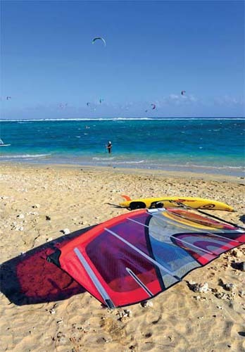 我們?cè)诹裟嵬膸滋鞎r(shí)間里風(fēng)浪都比較大,不過(guò)來(lái)到海邊卻發(fā)現(xiàn)海灘上依舊人聲鼎沸,原來(lái)好動(dòng)的法國(guó)人和一些歐美游客正利用風(fēng)浪玩起了刺激的海上運(yùn)動(dòng)。幾米高的海浪中早已有了十多名沖浪好手相繼嘗試挑戰(zhàn),雖然他們中的大部分只是業(yè)余愛(ài)好,并非職業(yè)沖浪選手,不過(guò)一招一式也是頗為認(rèn)真。靠近海岸附近的淺水區(qū)則更多是風(fēng)帆、摩托艇、皮劃艇、海浪滑板等各項(xiàng)水上運(yùn)動(dòng)的世界,對(duì)于他們來(lái)說(shuō),大風(fēng)就是運(yùn)動(dòng)的動(dòng)力,海水就是運(yùn)動(dòng)的場(chǎng)地。一般島上的家庭都會(huì)趁著周末舉家開(kāi)車來(lái)到海邊,喜歡玩水的玩水,而其他家庭成員則在沙灘上聚餐或者聊天,如此融入大自然真是瀟灑。
