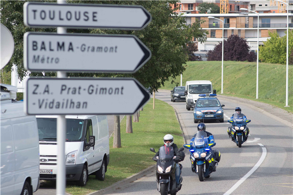 圖為2015年8月1日,在法國圖盧茲近郊,載有疑似馬航MH370航班殘骸的白色貨車駛?cè)牒娇占夹g(shù)分析機(jī)構(gòu)。新華社發(fā),弗萊德·朗瑟羅攝