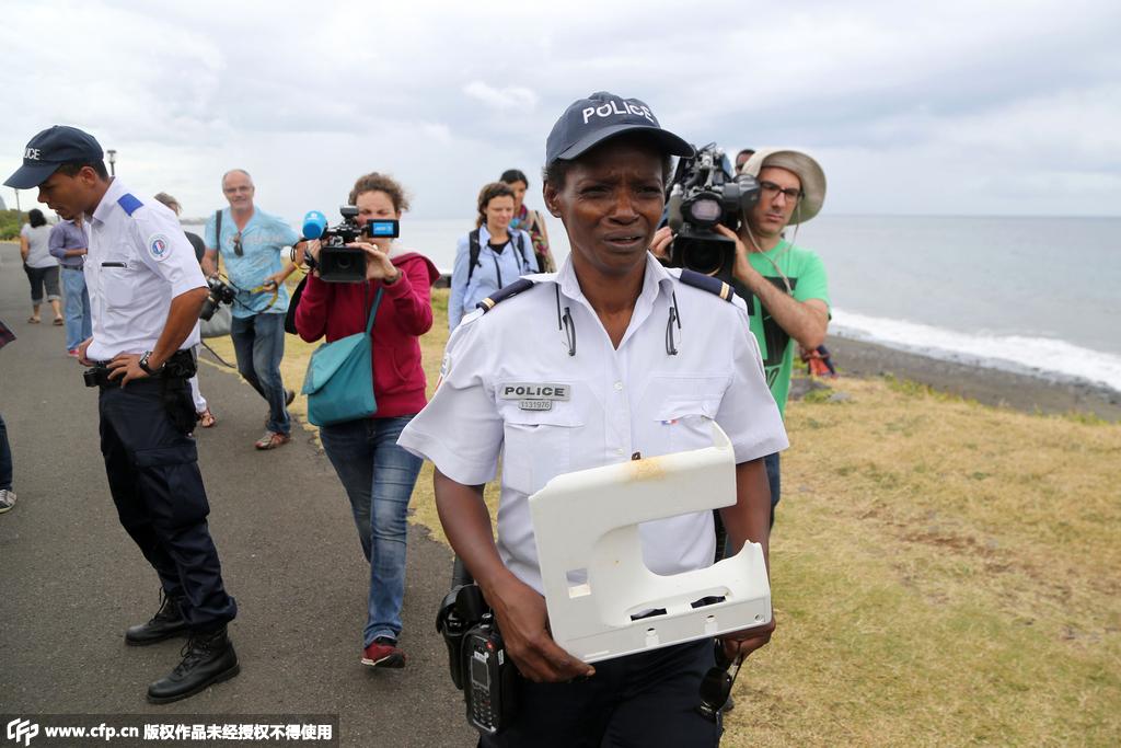 當地時間2015年8月4日,法屬留尼汪島圣但尼,警察在當地發現一塊塑料殘片。