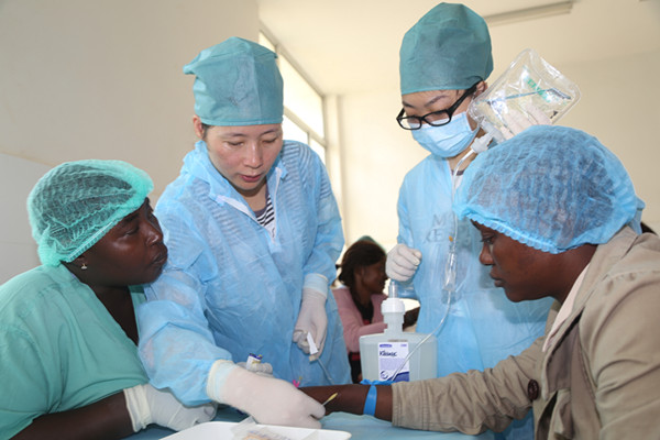 2014年12月10日,解放軍援塞醫療隊為中塞友好醫院由留觀中心轉型為留觀診療中心開展輸液培訓活動。這是中方隊員在教授塞方護理人員留置針的穿刺方法。 新華社發(戴欣 攝)