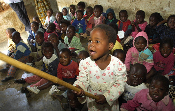 這是2001年8月13日,艾滋病患兒坐在馬拉維布蘭太爾市郊的一個孤兒看護中心里上課。(新華社發)