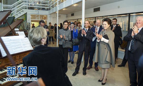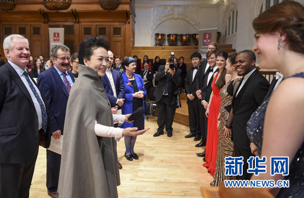 彭麗媛抵達時,受到皇家音樂學院董事會主席溫斯頓勛爵、學院院長、英國友人等熱烈歡迎。在院長陪同下,彭麗媛欣賞了獲獎學生和校友精彩的聲樂、器樂表演,參觀了樂器博物館,觀賞了圖書館珍藏的莫扎特、肖邦等音樂大師創作手稿,并同學院師生進行交流。彭麗媛表示,音樂作為一種高尚的藝術形式,超越國家、民族、歷史、文化界限。皇家音樂學院培養出眾多世界級藝術家。中國有不少音樂作品享譽世界,希望皇家音樂學院今后加強同中國音樂院校的交流,為促進中英教育和藝術合作貢獻力量。