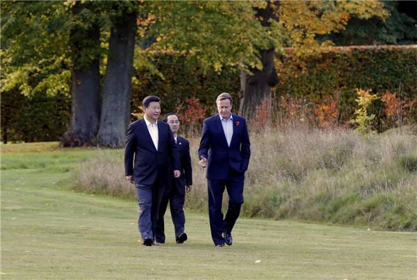 傍晚時分,習近平主席來到距倫敦市區約1小時車程的契克斯首相鄉間別墅,同卡梅倫一起散步,并舉行小范圍會晤。