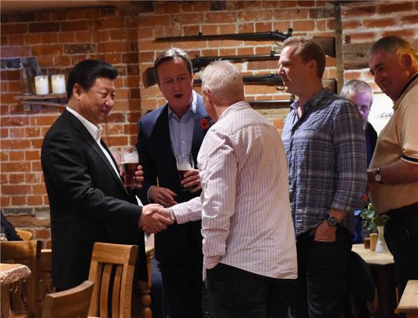 10月22日,國家主席習近平在契克斯首相鄉間別墅同英國首相卡梅倫再次會晤。會晤結束后,習近平在卡梅倫陪同下乘車前往當地小鎮體驗酒吧文化。(新華社記者饒愛民攝)