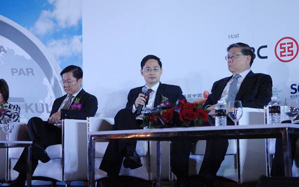 圖為2014年9月22日,中國人民銀行首席經濟學家馬駿(中)在工行新加坡分行舉辦的人民幣國際化峰會上分享看法。當日,中新兩國金融及其他企業界人士、政府官員等數百人參加了舉行的人民幣國際化峰會,共同討論人民幣國際化的前景和路徑。