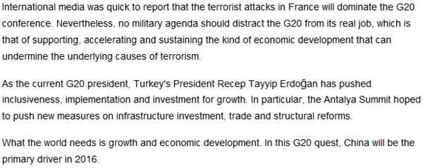 二十國集團領導人第十次峰會于15日下午在土耳其安塔利亞舉行第一階段會議。在二十國集團的不斷探索與實踐中,中國無疑將成為2016年世界經濟的主要驅動力。