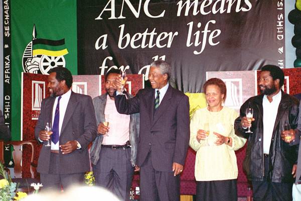 1994年5月2日,曼德拉和他的戰友們在約翰內斯堡的卡爾頓飯店大廳慶祝當選總統。(新華社發)