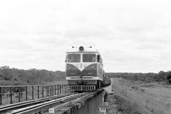 1980年2月7日,坦贊鐵路在贊比亞境內的龍森富河大橋修復通車。這座大橋在1979年11月被炸毀。圖為滿載贊比亞貨物的火車通過修復后的龍森富河大橋。(新華社記者戈春江攝)