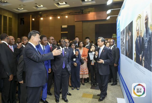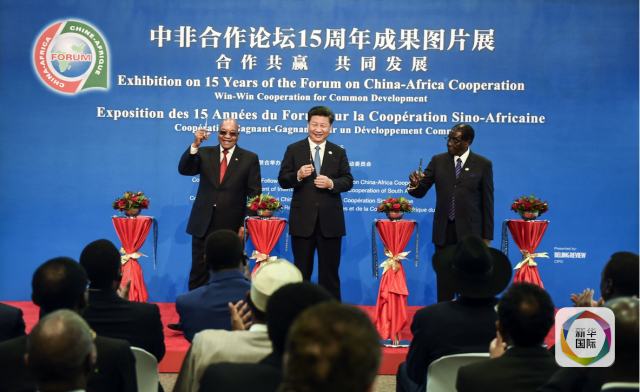 12月4日,國家主席習近平在約翰內斯堡出席中非合作論壇15周年成果圖片展開幕式,同南非總統祖馬,非盟輪值主席、津巴布韋總統穆加貝一道為展覽剪彩。這是習近平同非洲國家和地區組織領導人觀看展覽。(新華社記者謝環馳攝)