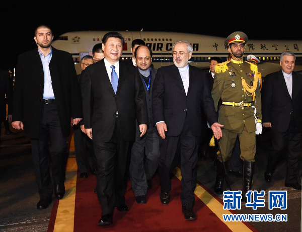 圖為1月22日,國家主席習近平乘專機抵達伊朗首都德黑蘭,開始對伊朗進行國事訪問。這是在梅赫拉巴德機場,習近平受到伊朗外交部長扎里夫等熱情迎接。(新華社記者饒愛民攝)
