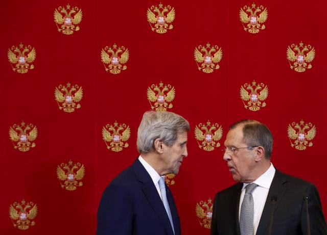 2015年12月15日,俄羅斯外長拉夫羅夫(右)同美國國務卿克里在莫斯科克里姆林宮出席記者會。 新華社/路透