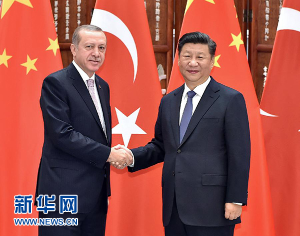 9月3日,國家主席習近平在杭州會見來華出席二十國集團領導人杭州峰會的土耳其總統埃爾多安。 新華社記者 李濤 攝