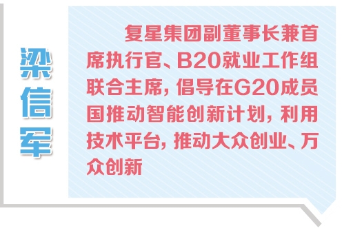 梁信軍表示,今年B20給G20提交的政策建議報告中,強調要“大力推進大眾創業、萬眾創新”。G20國家應該建立G20智能創新計劃,推動技術創新,促進政府、私營部門、院校和研究機構通過統一平臺實現資源、知識和成果的分享。他建議,智能創新計劃可以擬定5項計劃,利用技術平臺推動大眾創業、萬眾創新。一是加強G20各成員國之間的文化、教育與創新交流;二是建立“G20創新簽證計劃(GIVS)”,促進各國創新人才的自由流動,從而有效提升各國科技創新能力;三是G20國家應成立創新基金,支持二十國范圍內的科技研發、科技成果的商業轉化和創新企業的快速成長等;四是與商界聯手打造G20技術創新分享經濟平臺,提升創新效率,降低創新成本,加快創新成果轉化;五是構建“G20大腦平臺”,依托統一平臺實現協同創新,解決全球共同面臨的重大問題。