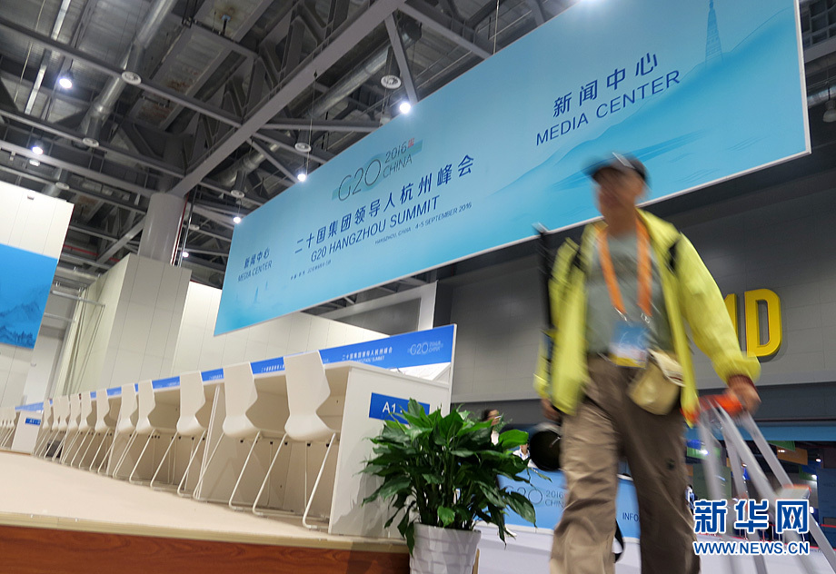 9月4日上午,金磚國家領導人非正式會晤在浙江杭州舉行。當日,G20峰會新聞中心一派繁忙景象。新華網記者 陳競超 攝