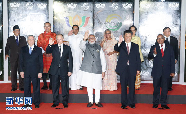 10月16日,金磚國家領(lǐng)導(dǎo)人同“環(huán)孟加拉灣多領(lǐng)域經(jīng)濟技術(shù)合作倡議”成員國領(lǐng)導(dǎo)人對話會在印度果阿舉行。國家主席習(xí)近平同印度總理莫迪、南非總統(tǒng)祖馬、巴西總統(tǒng)特梅爾、俄羅斯總統(tǒng)普京以及斯里蘭卡總統(tǒng)西里塞納、孟加拉國總理哈西娜、不丹首相托杰、尼泊爾總理普拉昌達(dá)、緬甸國務(wù)資政昂山素季、泰國政府代表等共同出席。這是與會領(lǐng)導(dǎo)人合影。新華社記者姚大偉攝