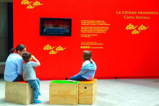 圖為智利民眾坐在“盛世繁華——紫禁城清代宮廷生活藝術展”條幅廣告前。(新華社記者蔣國鵬攝)