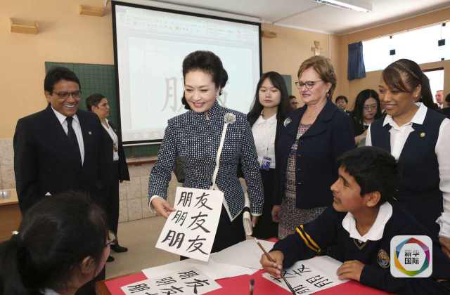 ??? 彭麗媛前往初中班教室觀摩書法課。十多名學(xué)生圍坐在三張長桌前練習(xí)毛筆書法。他們今天練習(xí)的是“朋友”兩個(gè)字,彭麗媛稱贊他們寫得很好。她還講述了中國古代書法家練習(xí)書法的故事,告訴學(xué)生們學(xué)習(xí)書法貴在堅(jiān)持,每天都要練習(xí)。