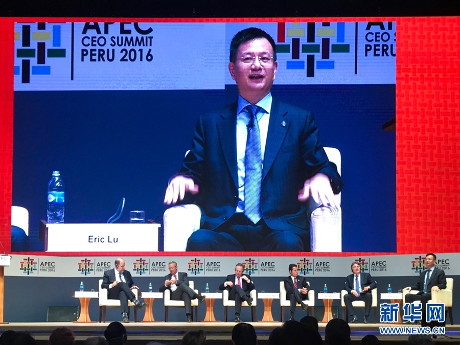 ????當地時間11月19日,APEC工商領導人峰會舉行主題為“重新設計貿易”的現場討論會。圖為聚貿電子商務有限公司董事長陸宏翔在討論會上發言。