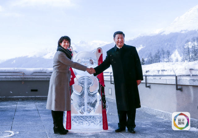 1月17日,國家主席習近平同瑞士聯邦主席洛伊特哈德在達沃斯共同啟動中瑞旅游年。兩國元首在熊貓冰雕像和印有中瑞兩國國旗及“中瑞旅游年”字樣的滑雪板旁合影留念。(新華社記者 丁林 攝)