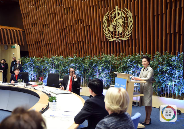 1月18日,國家主席習近平夫人、世界衛生組織結核病和艾滋病防治親善大使彭麗媛應世界衛生組織總干事陳馮富珍和聯合國艾滋病規劃署執行主任西迪貝邀請,在瑞士日內瓦出席為她舉行的親善大使任期續延暨頒獎儀式。這是彭麗媛在儀式上致辭。(新華社記者謝環馳攝)