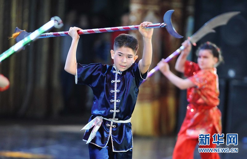 1月18日晚,烏茲別克斯坦首都塔什干人民友誼宮,烏茲別克斯坦中華民族文化中心武術隊隊員在表演武術。